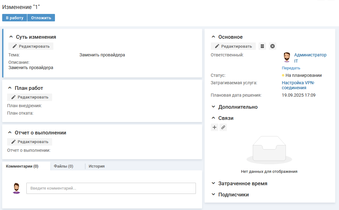 После завершения планирования изменения, специалист переводит изменение в статус "В работу".