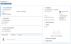 В рамках работы с изменением может потребоваться: создание задачи для распределения работ по заявке, проведение согласования, регистрация проблемы.