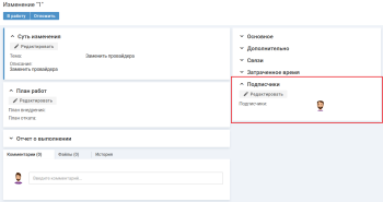 Чтобы добавить подписчиков изменения, в карточке изменения нажмите кнопку "Редактировать" в блоке "Подписчики". На форме редактирования заполните поле "Подписчики" и нажмите кнопку "Сохранить".
