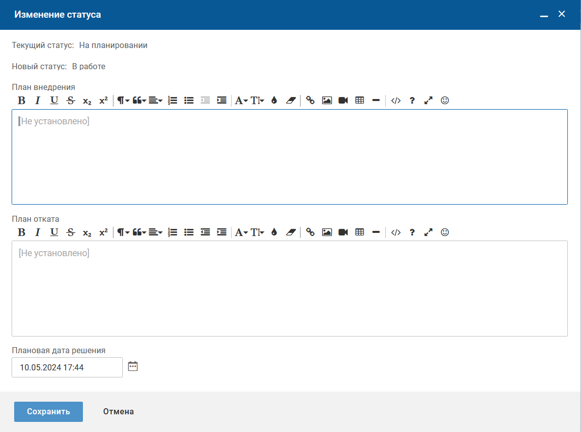 На форме изменения статуса заполните поле "Плановая дата решения" и нажмите кнопку "Сохранить". Изменение перейдет в статус "На планировании".