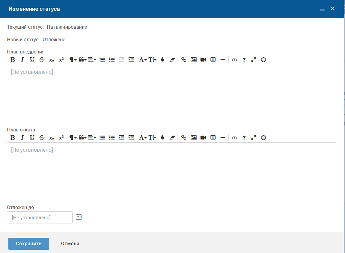 Чтобы в карточке изменения зафиксировать планы внедрения и отката, в карточке изменения нажмите кнопку "Редактировать" в блоке "План работ". На форме редактирования атрибутов заполните поля "План внедрения" и "План отката" и нажмите кнопку "Сохранить".