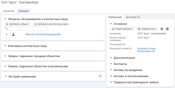 В системе доступны следующие действия с объектами обслуживания: создание объекта обслуживания, редактирование информации об объекте, перемещение объекта и архивирование карточки объекта обслуживания, также в карточке объекта обслуживания добавляются ключевые контактные лица.