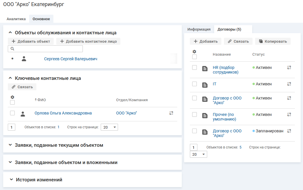 блок "Ключевые контактные лица" — содержит список контактных лиц, которые являются ключевыми для данного объекта обслуживания.