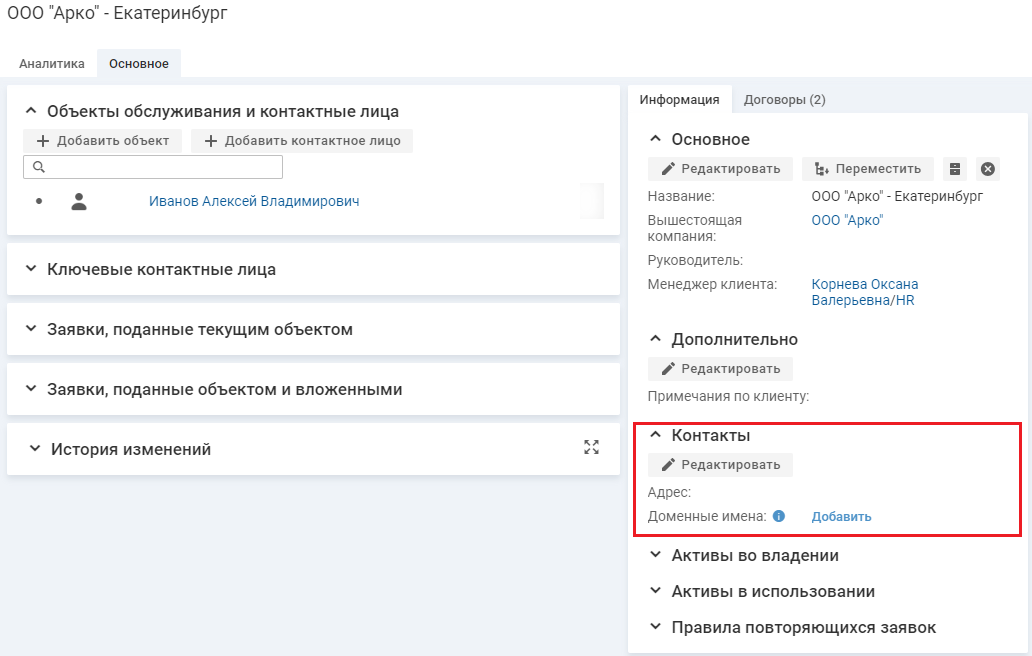 - "Активы в использовании" — отображаются активы, пользователем которых являются контактные лица данного объекта обслуживания.