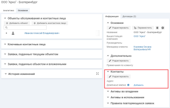 - Объект обслуживания, вложенные объекты обслуживания и их сотрудников нельзя будет выбрать как контактное лицо в заявках.