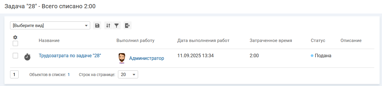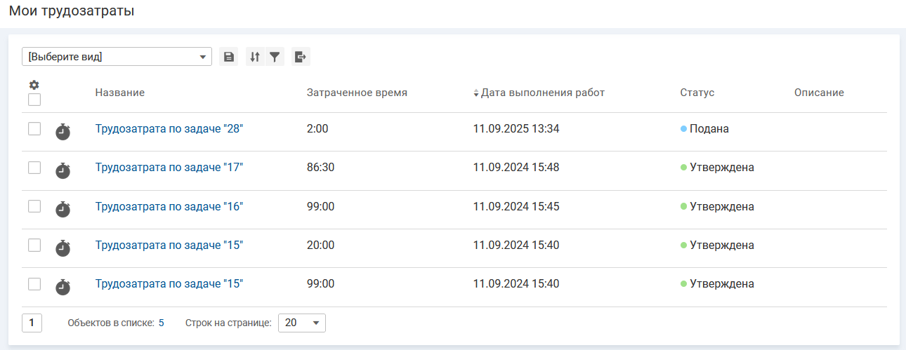 - "Статус" — отображается статус трудозатраты: "Подана", "Утверждена", "Отклонена".