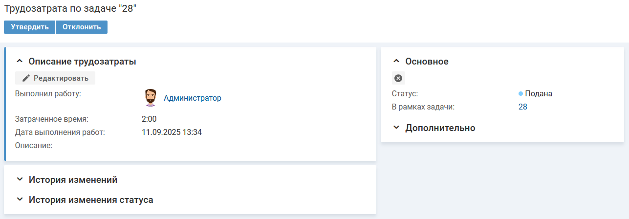 - "Кто принял решение" — отображается ответственный за решение по трудозатрате, строка появляется после утверждения или отклонения трудозатраты.