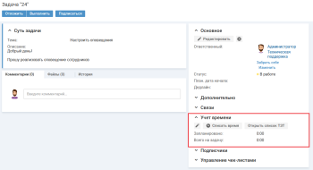 - "В рамках заявки (задачи, проблемы, изменения) — отображается номер заявки (задачи, проблемы, изменения) с возможностью перехода на соответствующую карточку.