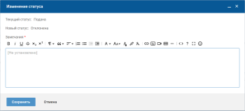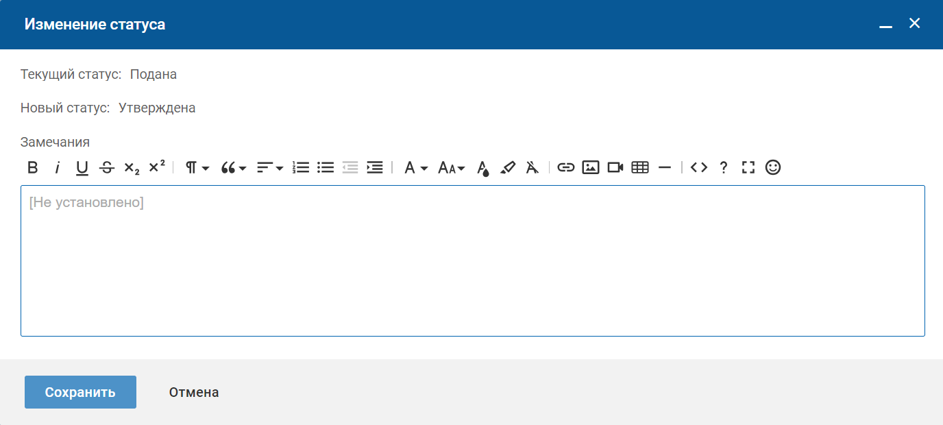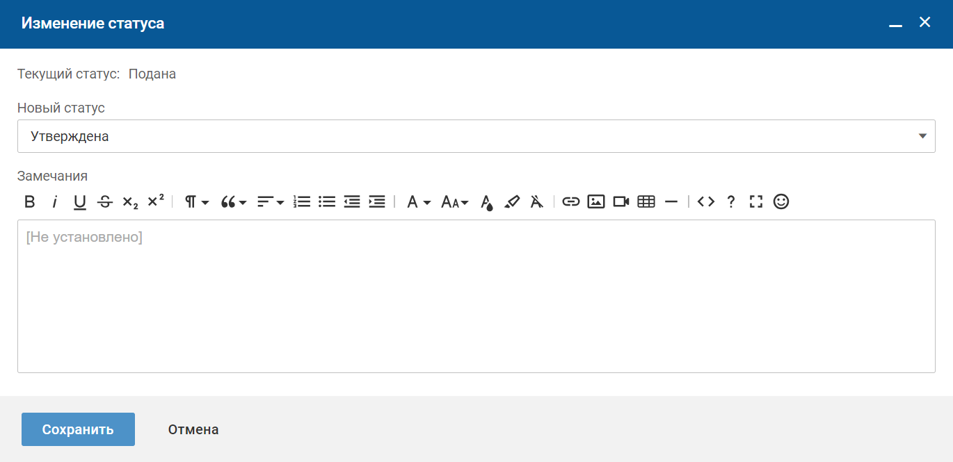 На форме изменения статуса выберите "Новый статус" (Отклонена или Утверждена), заполните поле "Замечание" и нажмите кнопку "Сохранить".