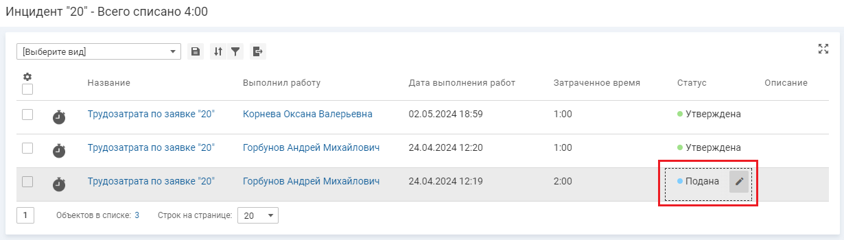 Поданные трудозатраты можно утвердить или отклонить в списке трудозатрат, выполнив одно из следующих действий: