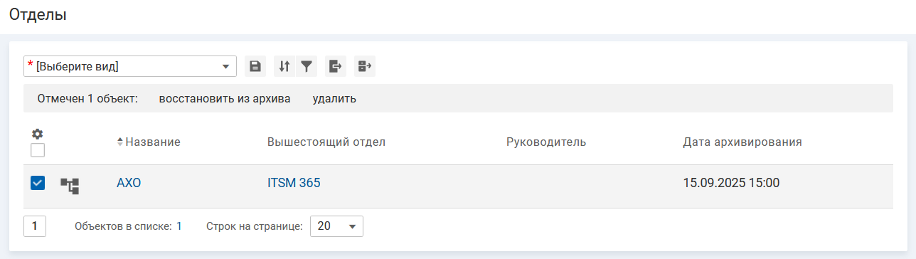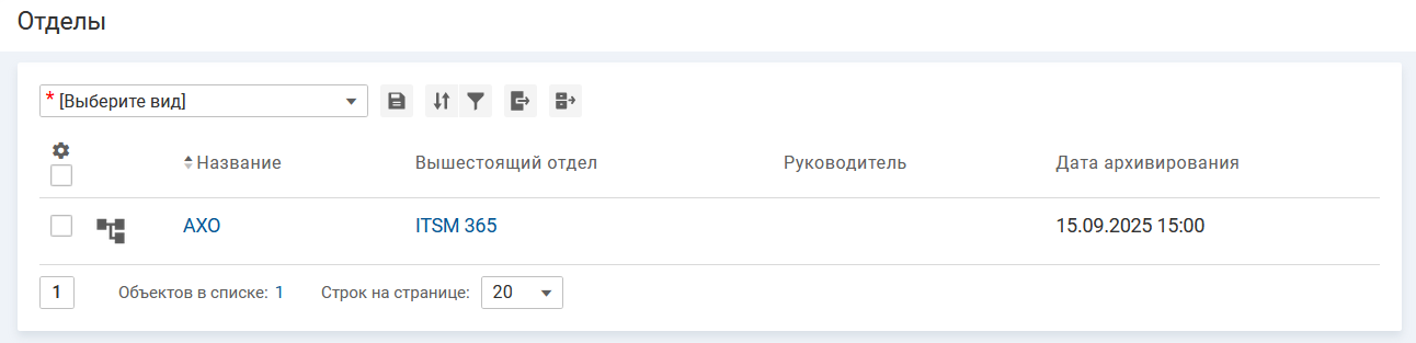 - Карточка отдела и вложенные в нее карточки отделов и сотрудников будут помещены в архив и доступны для просмотра в списке архивных объектов.