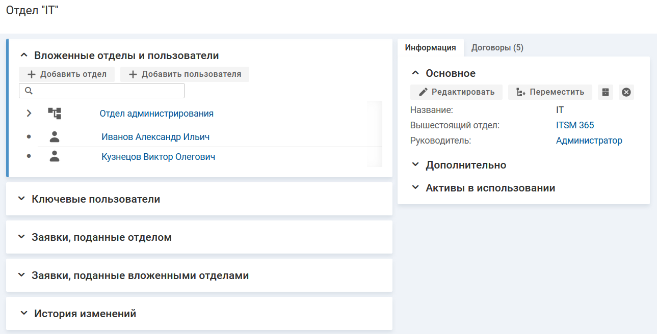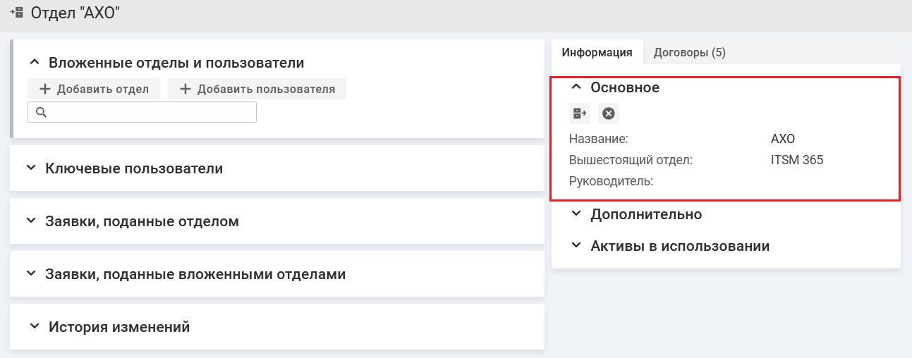 - "Основное" — отображается информация об отделе: название, ссылку на вышестоящий отдел и ссылку на руководителя отдела.