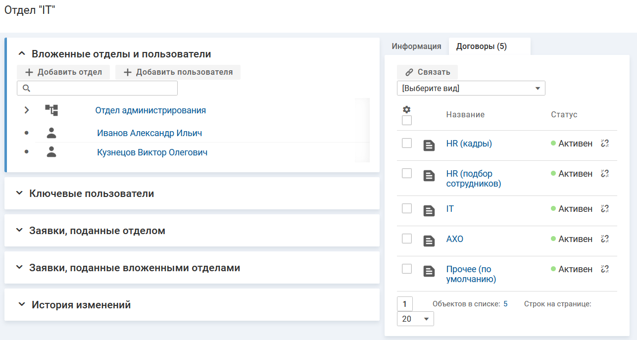 вкладка "Договоры" — содержит список договоров, в которых получателем является данный отдел, с возможностью перехода на карточку договора, подробнее.
