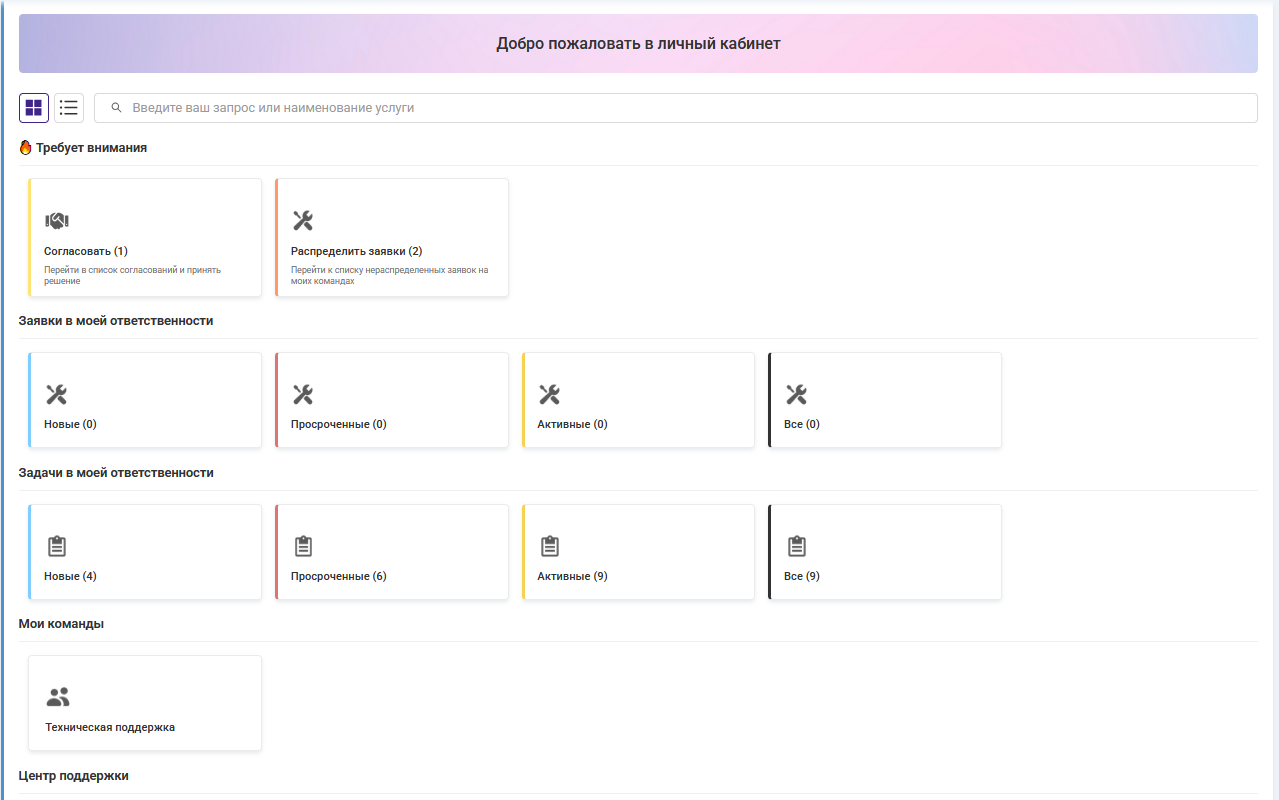 Блок "Центр поддержки" содержит плашки: