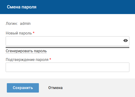 На форме "Смена пароля" укажите параметры нового пароля и нажмите кнопку "Сохранить".