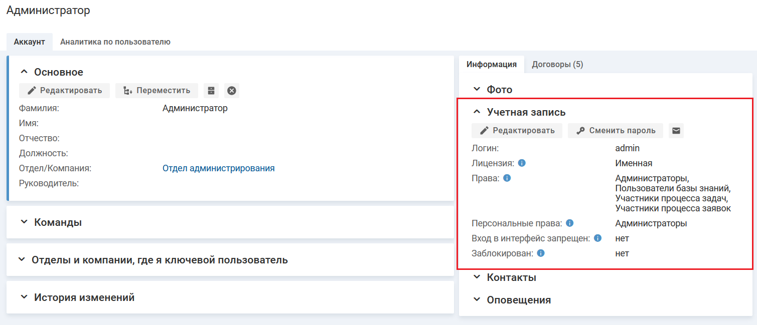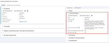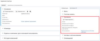 Чтобы указать адрес электронной почты, перейдите на карточку пользователя на вкладку "Аккаунт" и нажмите кнопку "Редактировать" в блоке "Контакты".