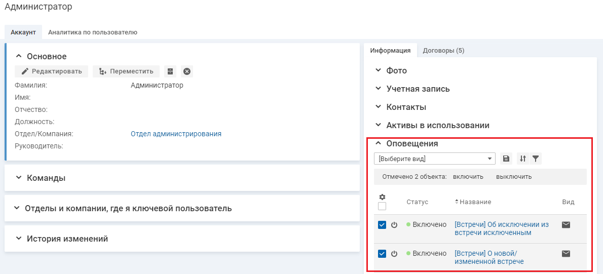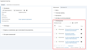 Чтобы включить/выключить оповещение, в карточке пользователя на вкладке "Аккаунт" → "Информация" в блоке "Оповещения" в строке оповещения нажмите иконку .