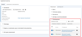 Чтобы массово управлять оповещениями, в карточке пользователя на вкладке "Аккаунт" → "Информация" в блоке "Оповещения" выберите нужные оповещения, установив флажок в списке, и нажмите ссылку "включить" или "выключить" на панели массовых операций.