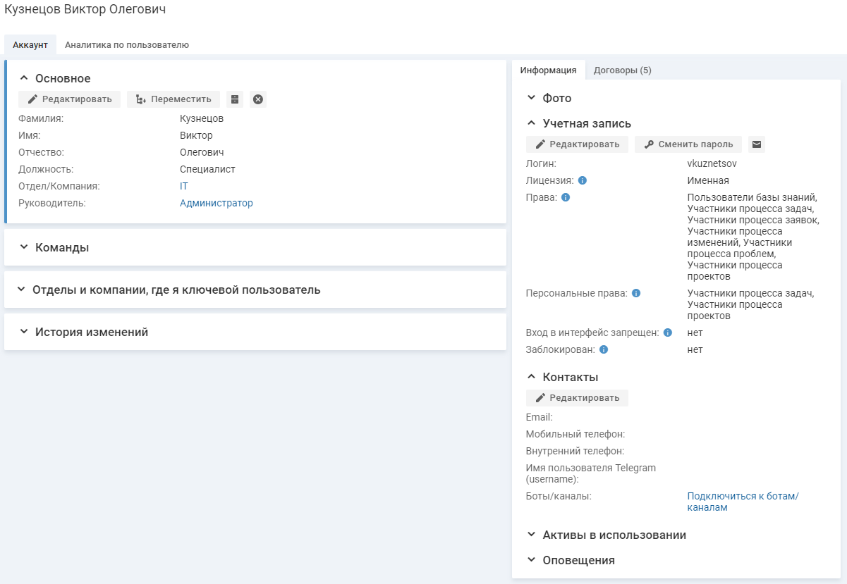 В системе доступны следующие действия с пользователем: изменение информации о пользователе, добавление пользователя в команды, перемещение, перевод в архив или удаление.