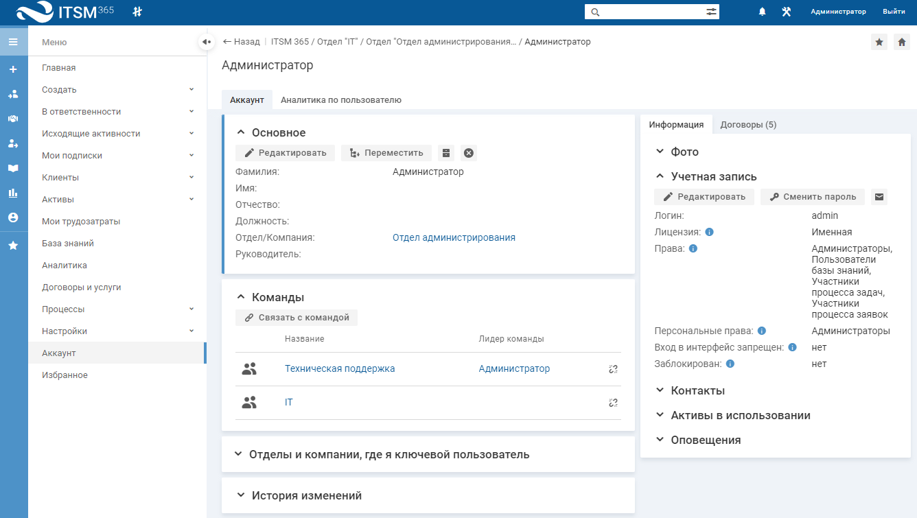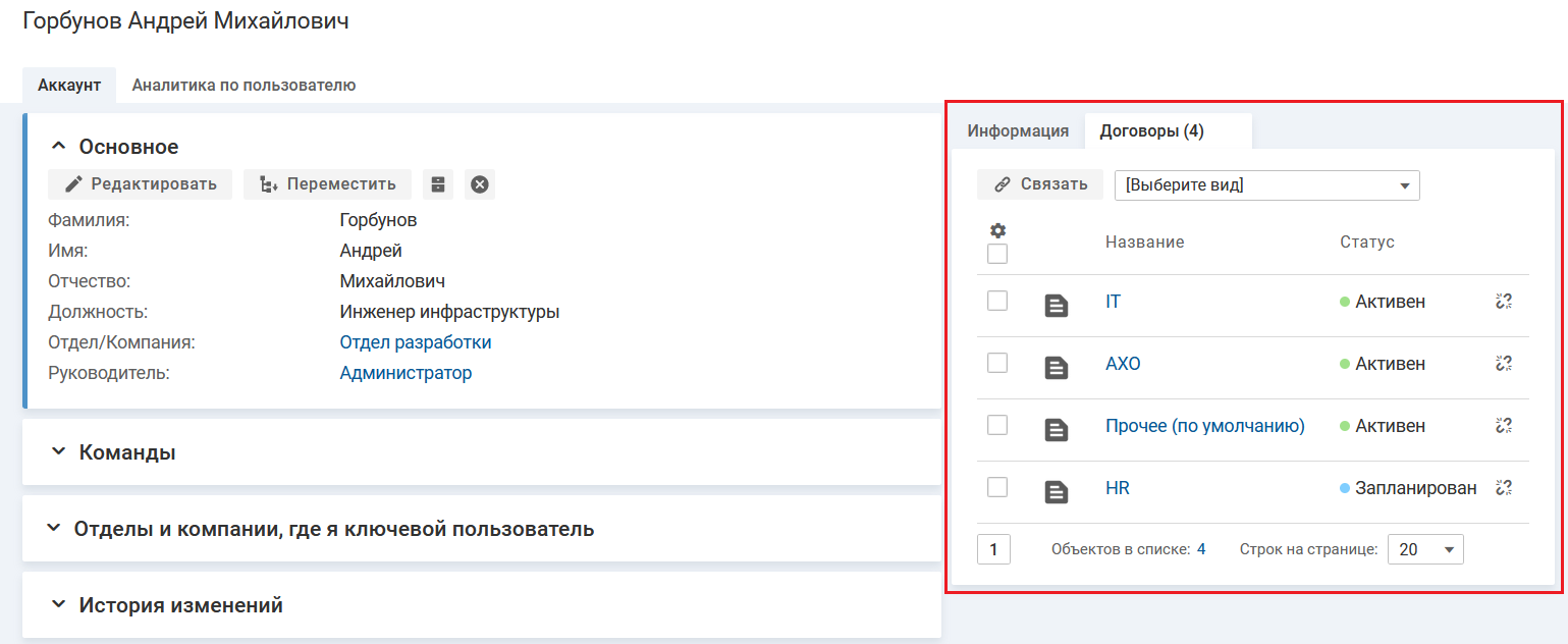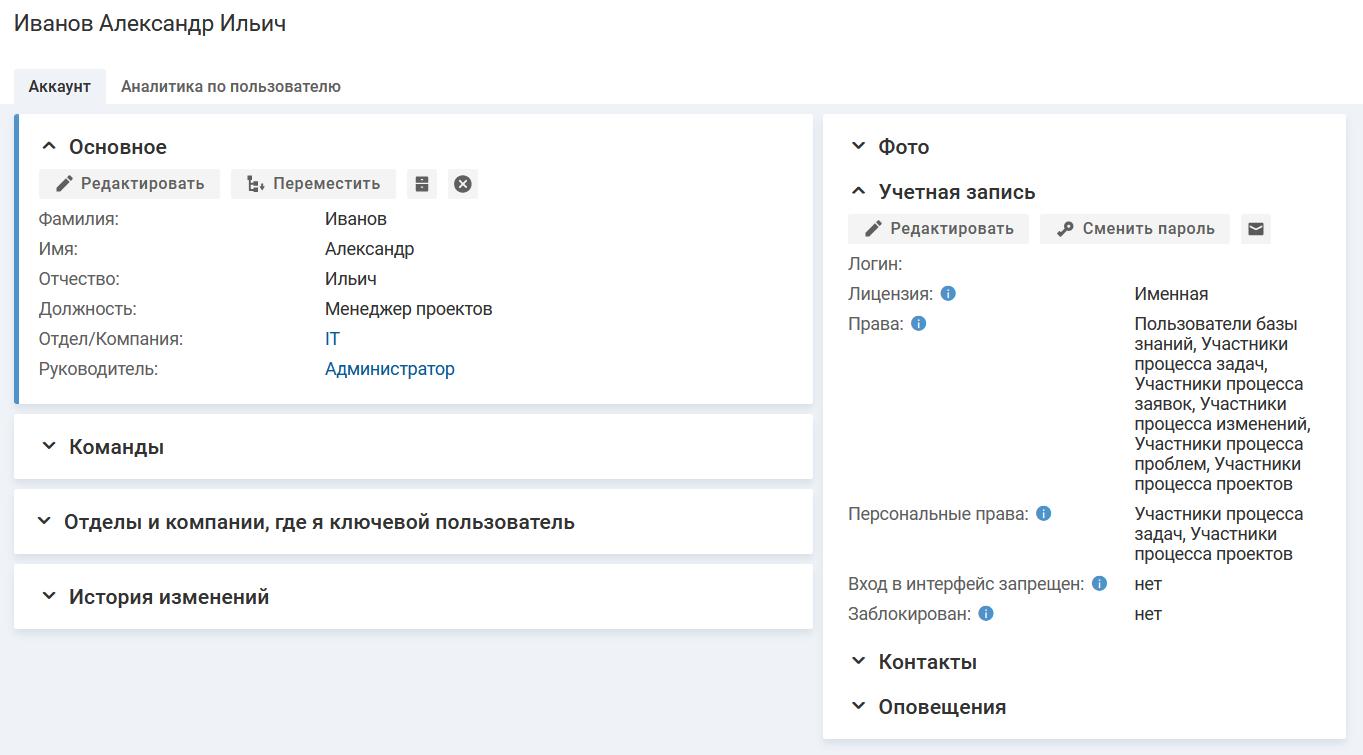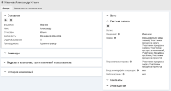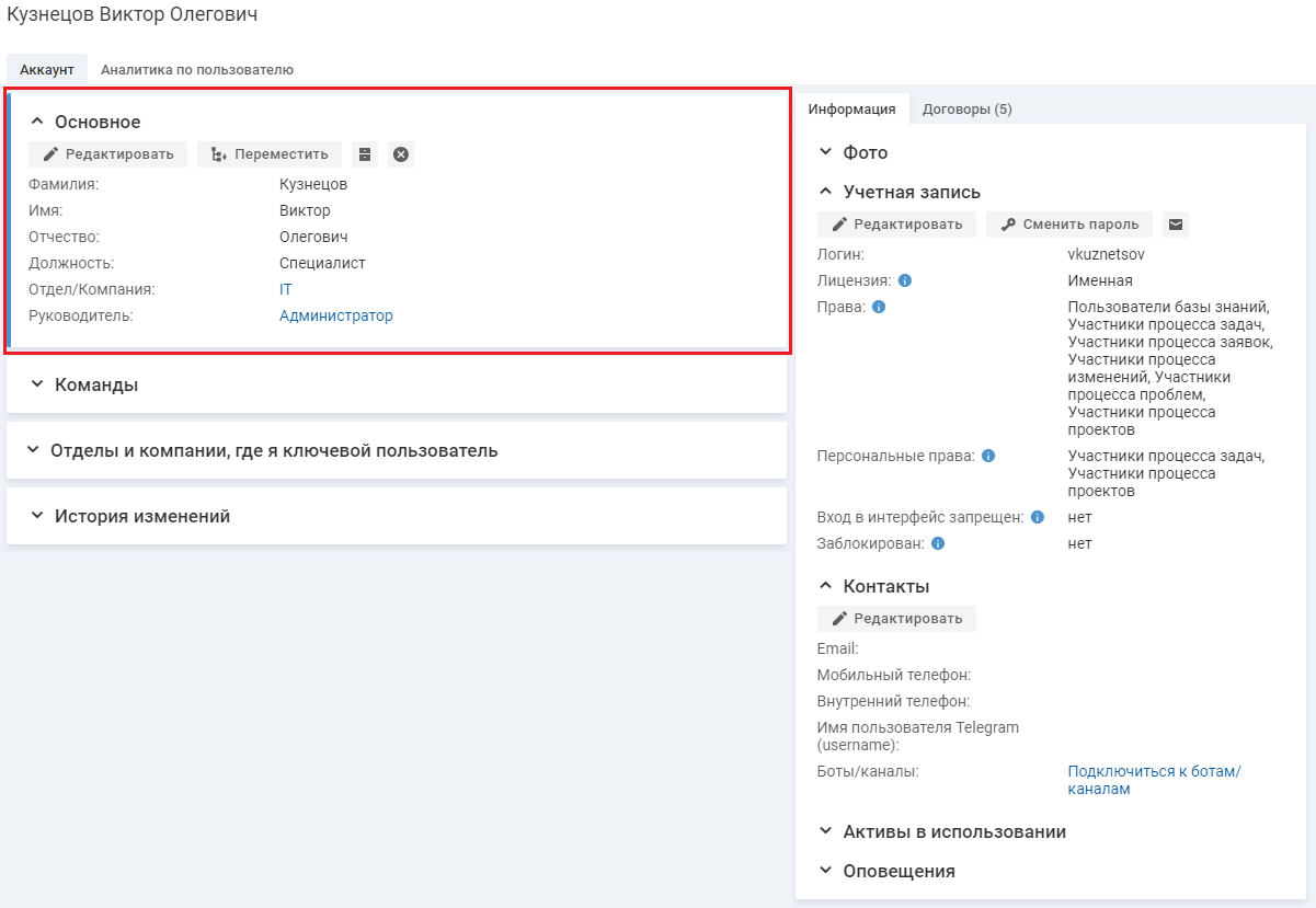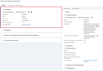 • блок "Основное" содержит информацию: ФИО, должность, отдел/компания, руководитель.