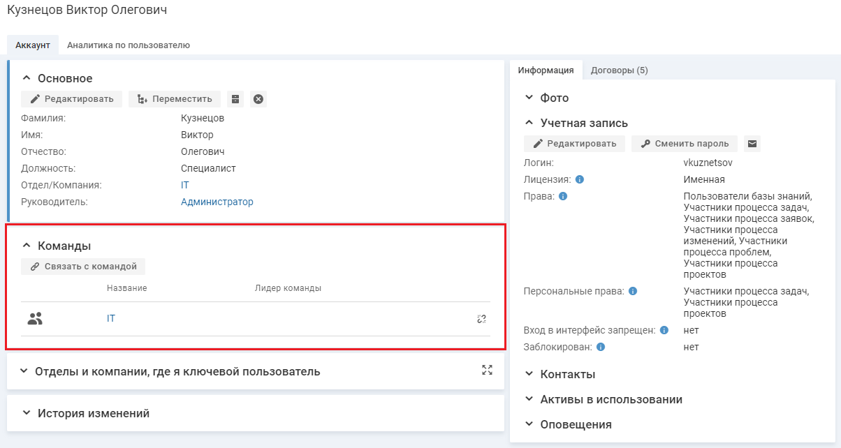 Чтобы добавить пользователя в команду, в карточке пользователя нажмите кнопку "Связать с командой" в блоке "Команды". На форме "Связать с командами" выберите команды и нажмите кнопку "Сохранить".
