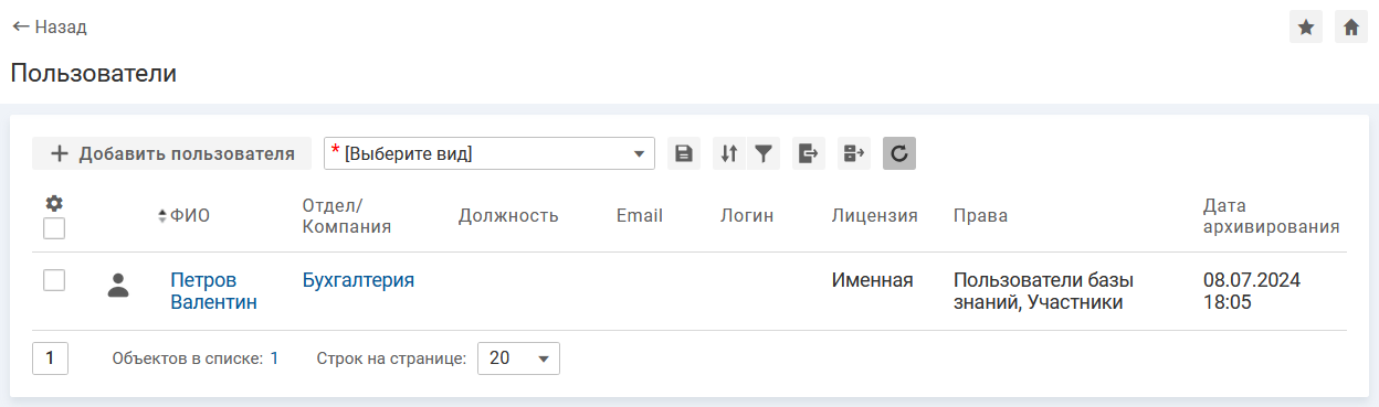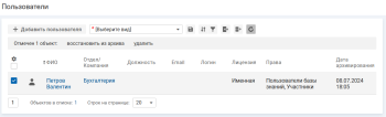 Чтобы посмотреть список архивных объектов, на странице "Пользователи" нажмите иконку на панели действий списка.