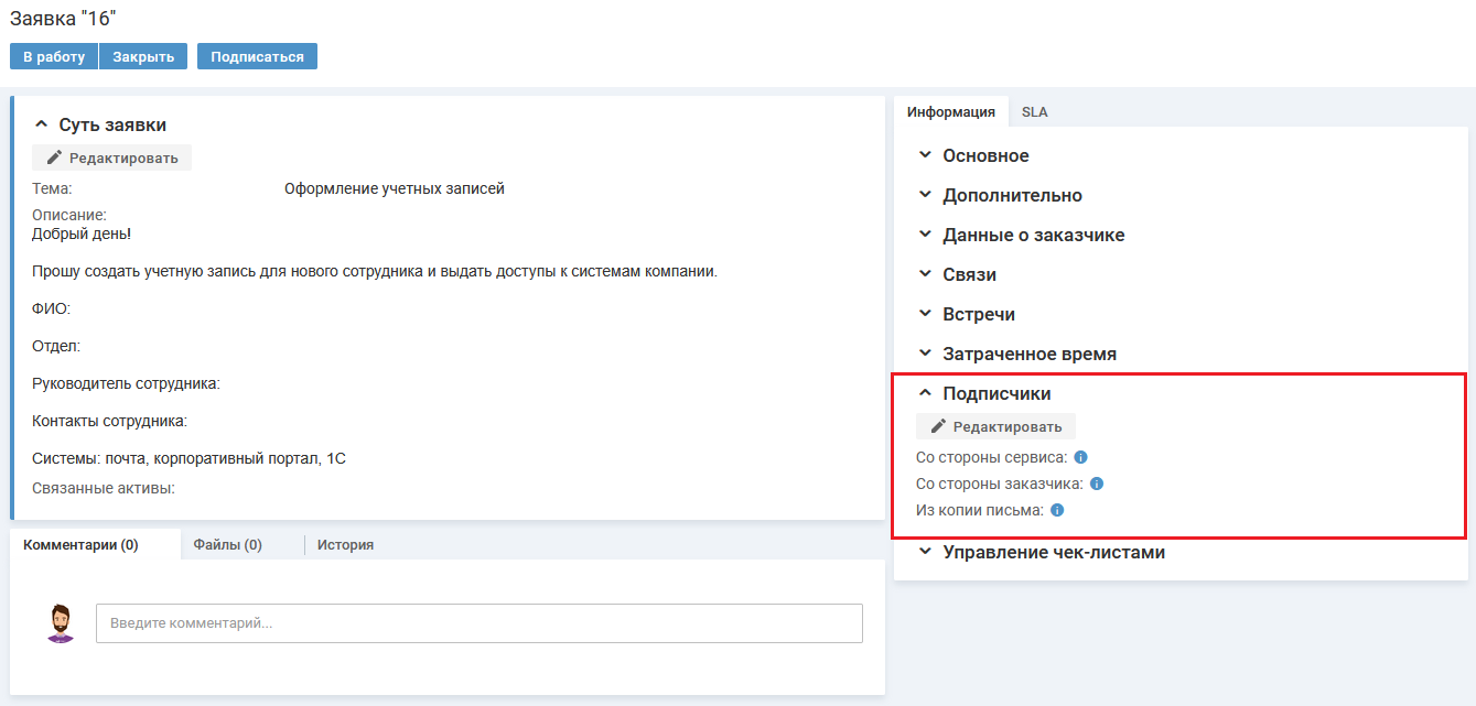 Если проблема в заявке касается нескольких заинтересованных лиц, то при регистрации заявки по почте можно добавить в копию письма почтовые адреса нужных пользователей. В созданной заявке в системе указанные пользователи будут добавлены как подписчики. Они будут получать уведомления по заявке и видеть прогресс по ней, а также иметь возможность ответить на заявку через письмо и добавить комментарий к ней.