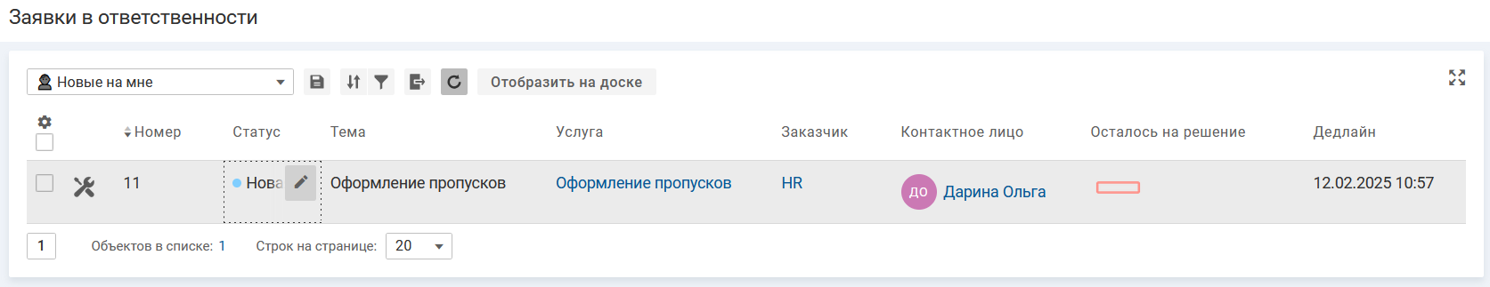 Специалист выбирает заявку из списка заявок в своей ответственности (вид "Новые на мне") и начинает работу с заявкой.