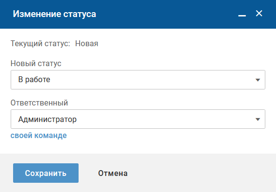 - Ответственный за заявку может передать ее в ответственность своей команде или другой команде.