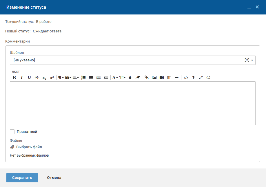 "Шаблон" — выберите один из доступных шаблонов комментариев. После выбора шаблона поле "Текст" будет заполнено значением из шаблона,