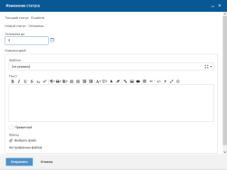 На форме изменения статуса укажите дату и время, до наступления которых будут отложены работы по заявке, а также причину приостановки работ в комментарии.
