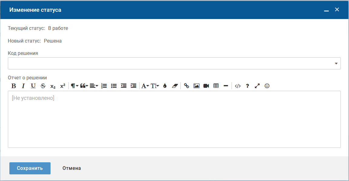 - "Отчет о решении" — отчета специалиста о завершении работ по заявке.