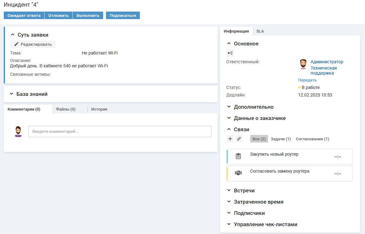 Если для продолжения работы по заявке необходимо уточнение от контактного лица, специалист может перевести заявку в ожидание ответа и уточнить информацию у контактного лица. После добавления комментария от контактного лица или любого другого пользователя из его отдела или компании, заявка автоматически вернется в работу.