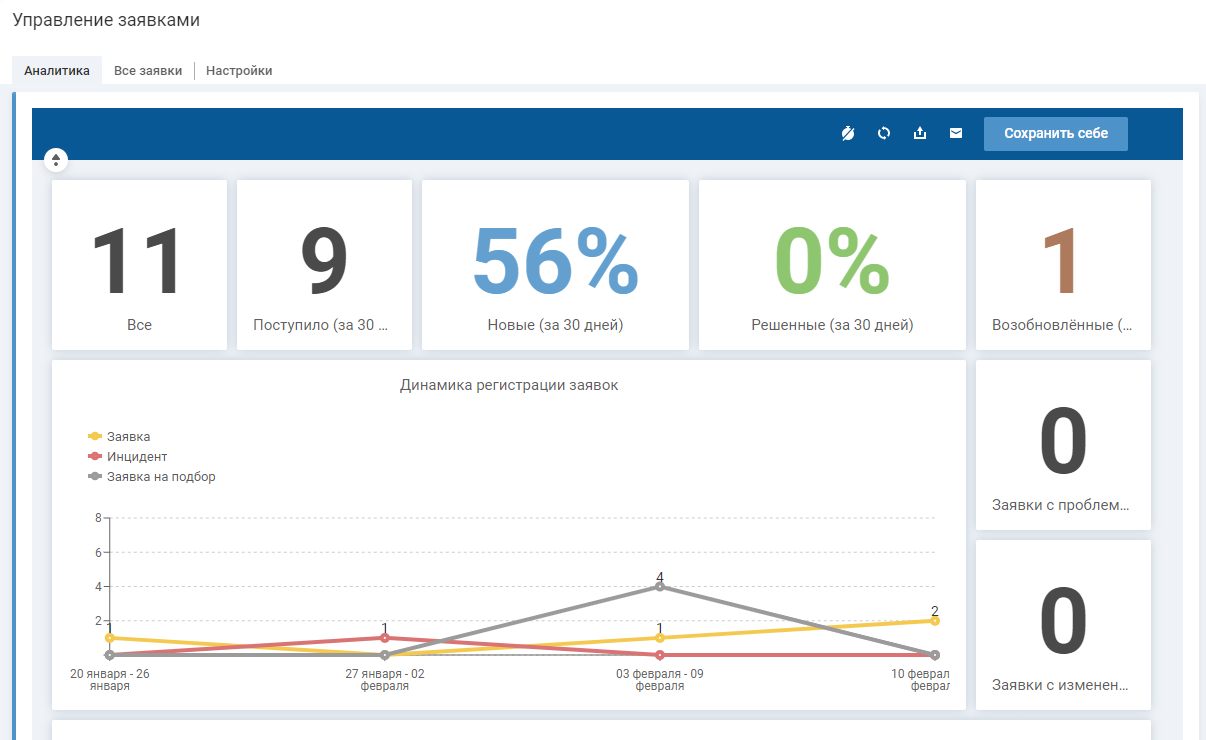 - Заявки c проблемами (заявки, которые были созданы за последние 30 дней и имеют связь с проблемой);