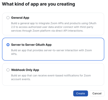 В правом верхнем углу экрана нажмите Develop → Build App , на открывшейся форме выберите приложение Server to Server OAuth App и нажмите кнопку Create.