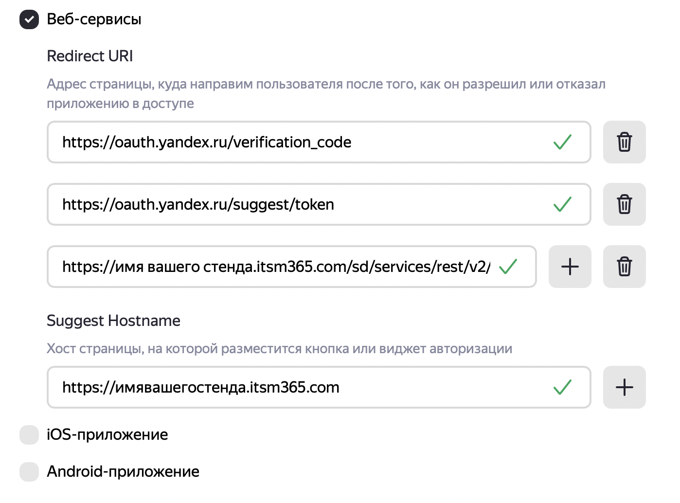 После создания приложения на сайте Яндекс необходимо настроить интеграцию вашего стенда ITSM 365 с сервисом Яндекс Телемост.