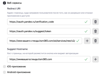 На странице формы добавления приложения "Платформы приложений" выберите пункт "Веб-сервисы" и заполните поля: