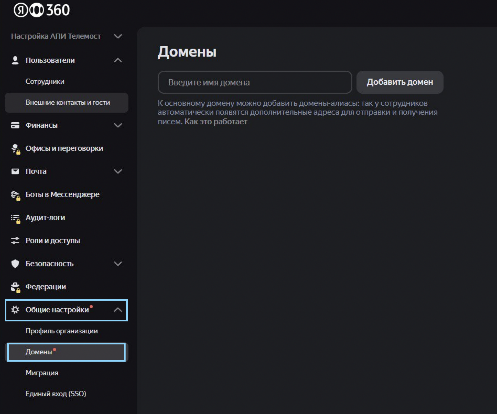 На странице созданной организации в левом меню выберите "Общие настройки" → "Домены" и в поле "Имя домена" введите домен.