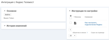 На карточке интеграции с Яндекс Телемост в блоке "Основное" нажмите кнопку "Войти", заполните поля на форме авторизации и нажмите кнопку "ОК".