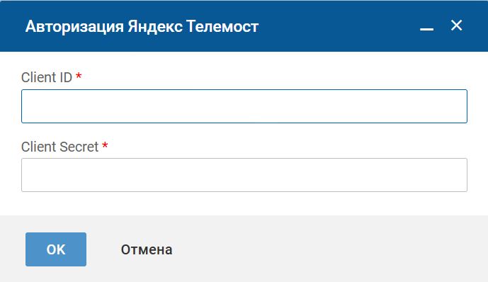 В полях на форме авторизации с Яндекс Телемост укажите коды авторизации, полученные после регистрации приложения на сайте Яндекс: