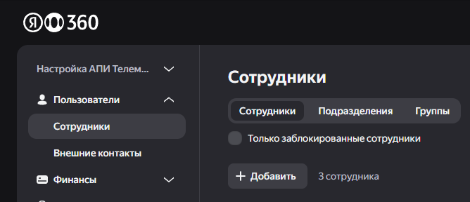 На странице созданной организации в левом меню выберите "Сотрудники" и нажмите кнопку "+ Добавить".