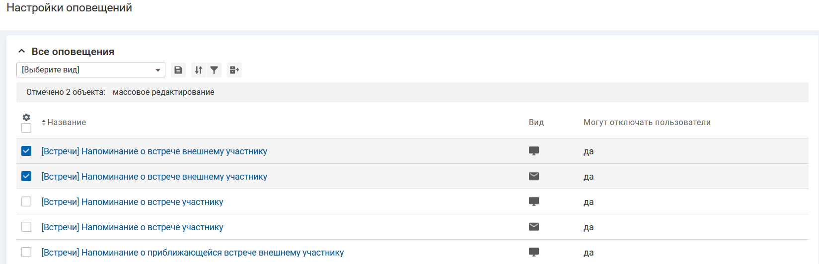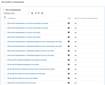 - "Вид" — вид оповещения: email-оповещение, push-уведомление в мобильном и в веб-приложениях.