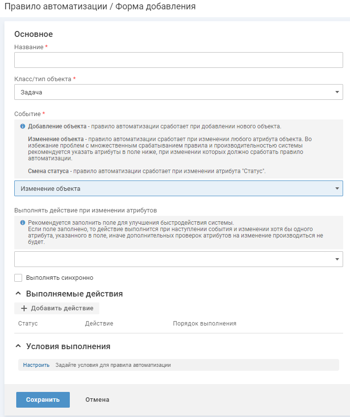 На форме добавления в блоке "Выполняемые действия" нажмите кнопку "+ Добавить действие". На форме добавления выберите действие, заполните его параметры и нажмите кнопку "Сохранить".