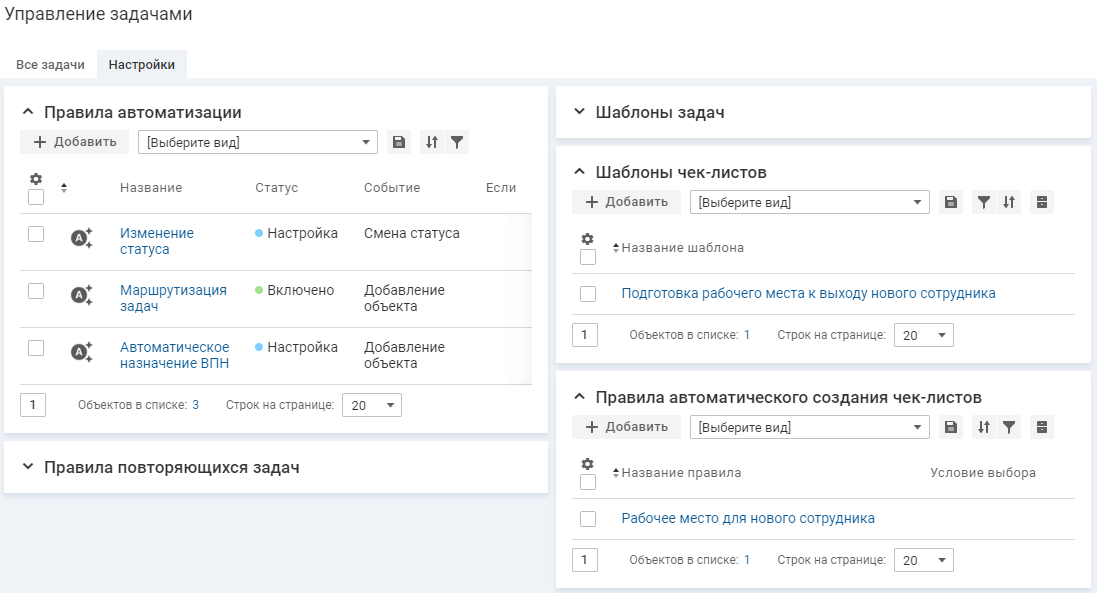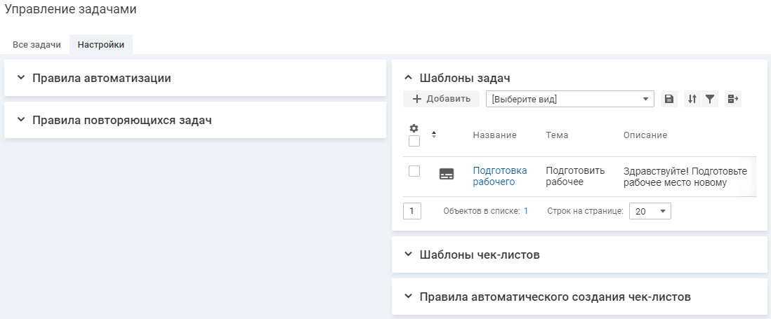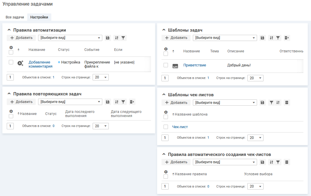 Настройка чек-листов для задач выполняется на вкладке "Настройки" в блоках "Шаблоны чек-листов" и "Правила автоматического создания чек-листов".