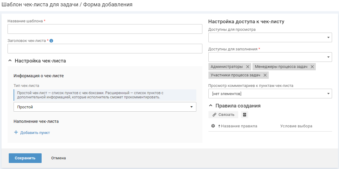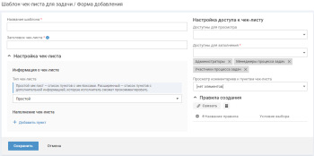 - "Доступен для заполнения" — определяется, какой группой должен обладать пользователь, чтобы он мог заполнять данный чек-лист.