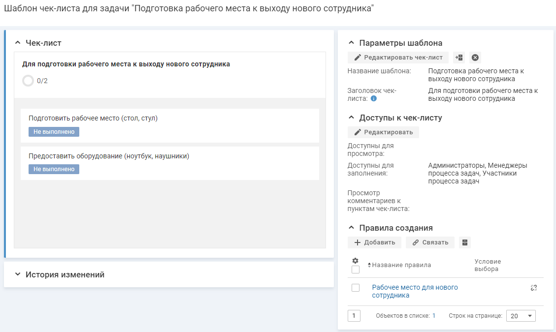 - "Правила создания" — отображается связь шаблона чек-листа и правила автоматического создания чек-листа.
