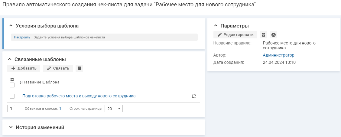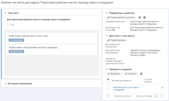 - блок "Правила создания" — отображается связь шаблона чек-листа и правила автоматического создания чек-листа.