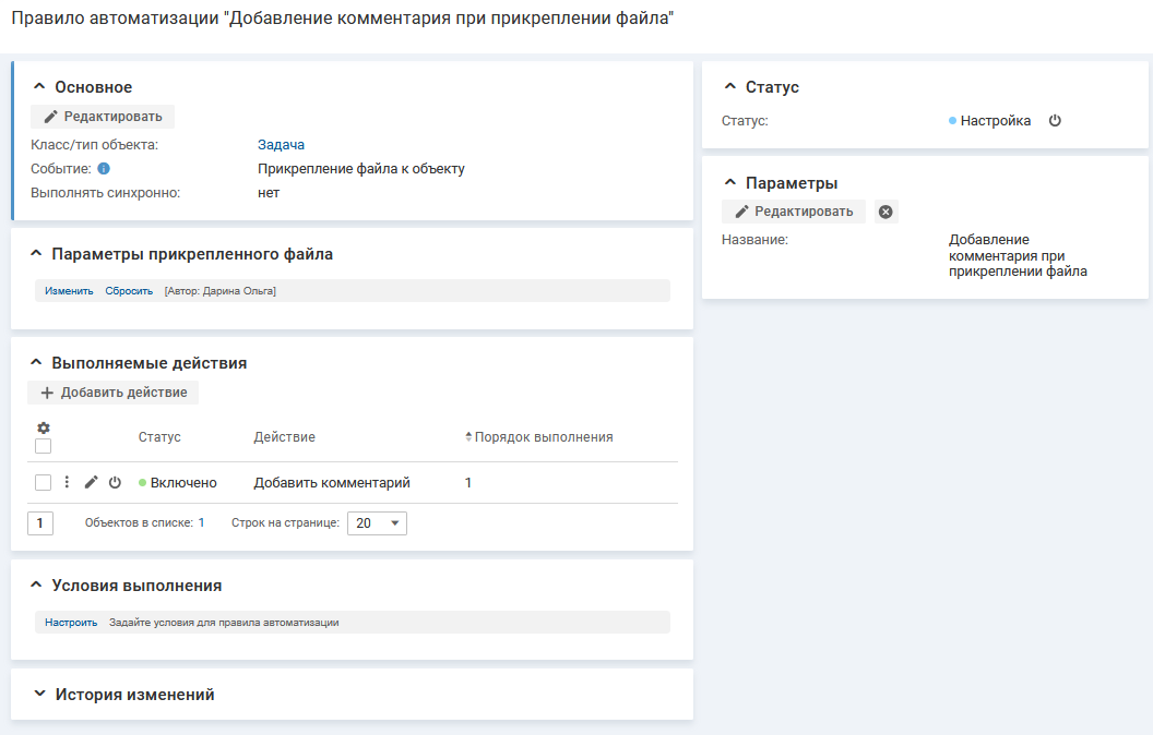 - "Параметры добавленного комментария" — отображается только при событии "Добавление комментария к объекту".