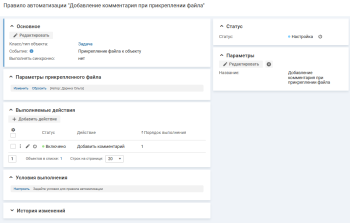 При выборе события "Добавление комментария к объекту" или "Прикрепление файла к объекту" появляется блок "Параметры добавленного комментария"или "Параметры прикрепленного файла" соответственно.