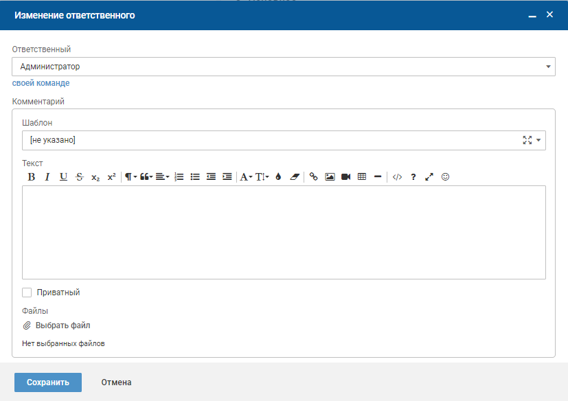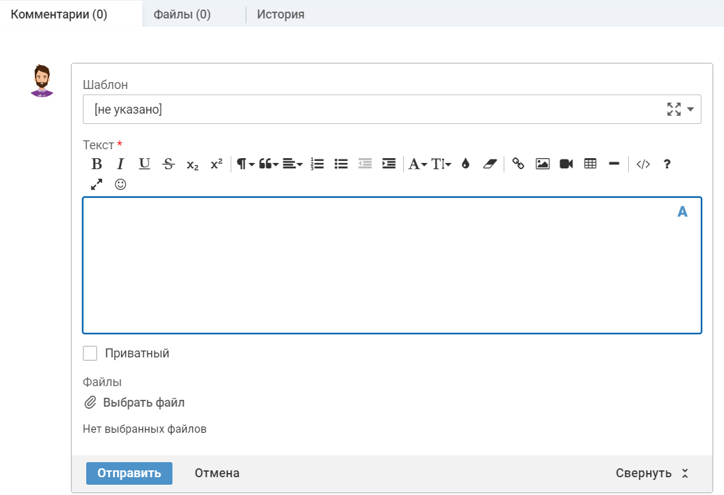 "Шаблон" — выберите один из доступных шаблонов комментариев. После выбора шаблона поле "Текст" будет заполнено значением из шаблона.
